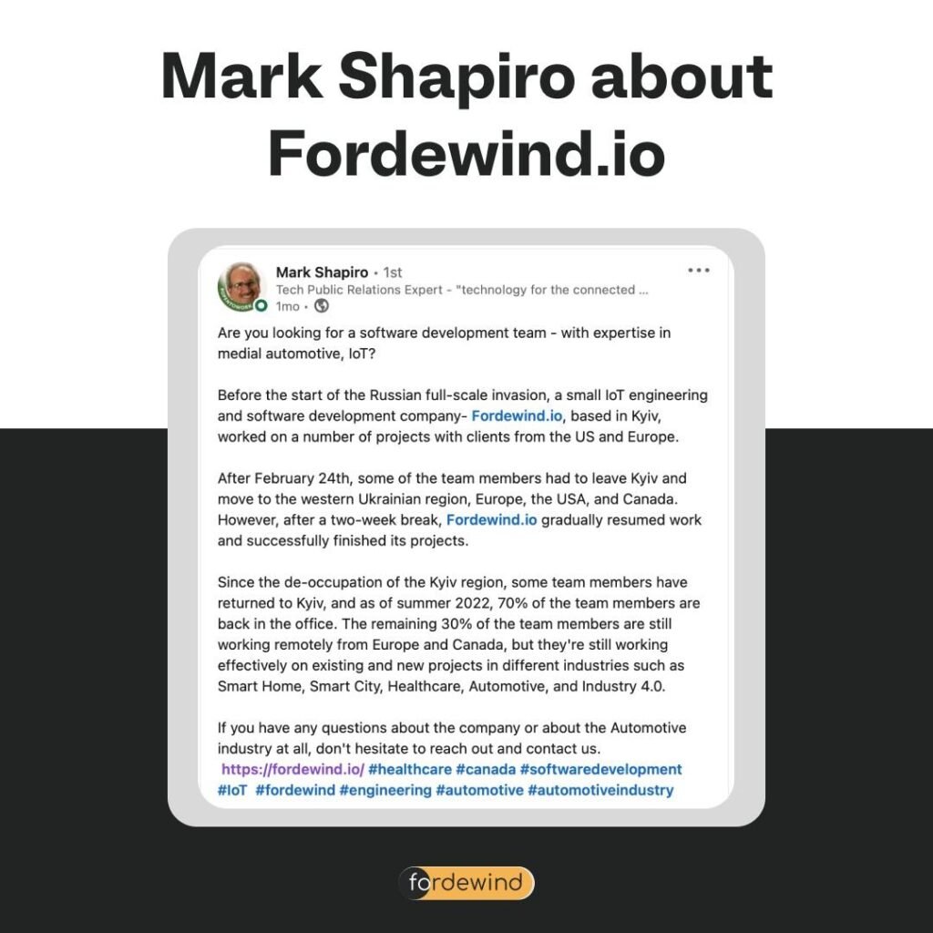 Mark highlighted our expertise in the medial automotive and IoT software development domains. Despite the challenges caused by recent events, our team at Fordewind.io, a Kyiv-based IoT engineering and software development company, remained committed to delivering exceptional projects. We faced temporary relocations, with team members dispersing to regions including Europe, the USA, and Canada. However, we quickly regrouped, resumed operations, and successfully completed our ongoing projects.